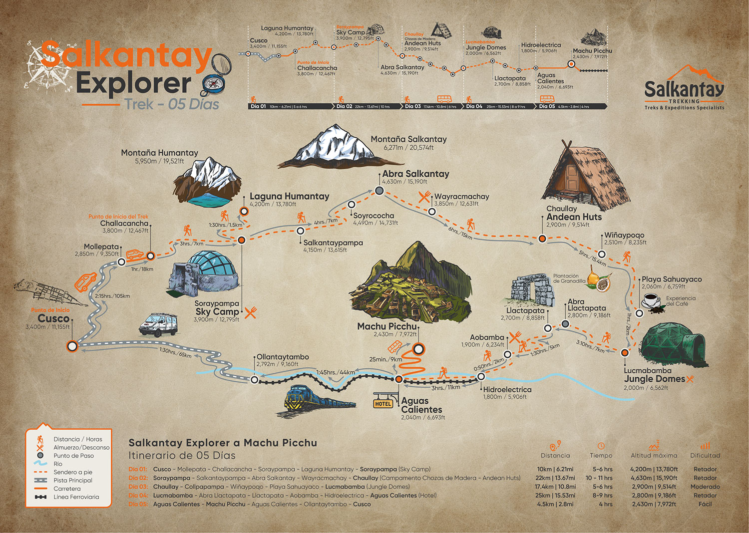 A lo largo de la travesía, el viajero transita desde majestuosos glaciares y lagunas turquesas de alta montaña hasta el bosque nuboso y la selva alta del Cusco, atravesando múltiples ecosistemas en una progresión natural única. El recorrido incluye hitos memorables como la Laguna Humantay, el imponente Abra Salkantay (4,630 metros/15,190 pies), la experiencia cafetera en la ceja de selva y la primera vista de Machu Picchu desde Llactapata, antes de culminar en la exploración guiada de la legendaria ciudadela inca.